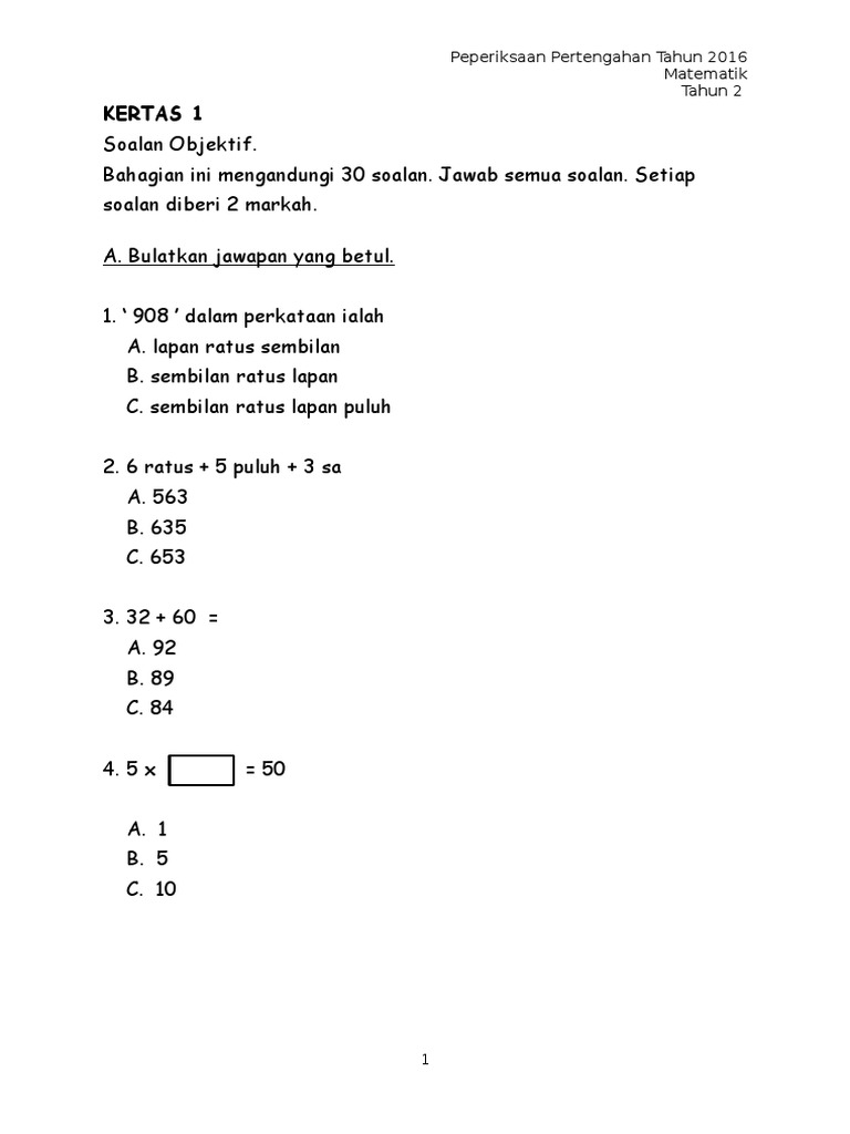 Contoh Kertas Soalan Matematik Tahun 1 2017 Mangopotent
